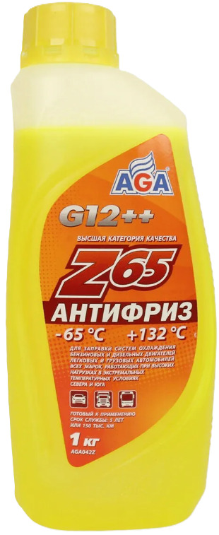Антифриз AGA Z65 готовый к применению, жёлтый, -65С. (946мл/1 кг) Предназначен для систем охлаждения бензиновых и дизельных двигателей легковых и грузовых автомобилей всех марок (иностранных и российских). Идеален для высокофорсированных двигателей, в том числе с турбонаддувом и интеркулером, а также для всех двигателей, работающих как при недостаточном обдуве встречным воздухом (например, в режиме городского цикла), так и в суровых зимних условиях. ОБЕСПЕЧИВАЕТ: Эффективную работу систем охлаждения без смены охлаждающей жидкости до 5 лет или 150 тыс. км пробега; Долговечную работу сальников водяного насоса (помпы); Надежную защиту всех металлических деталей системы охлаждения и двигателя от коррозии и кавитации. РАЗРАБОТАН: С учетом требований ASTM D 4985/5345; BMW N600 69.0; Daimler Chrysler DBL 7700.20; Audi, Porsche, Seat, Skoda, VW TL 774-D, type G-12; Ford WSS-M97B44-D, TTM АвтоВАЗ. ДОПУСКАЕТСЯ: Смешивать с качественными антифризами и тосолами любого цвета