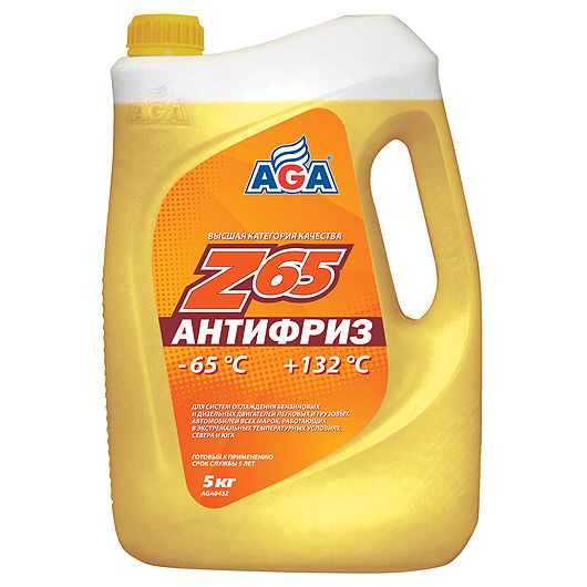 Антифриз AGA Z65 готовый к применению, жёлтый, -65С. (4.73л/5 кг) Предназначен для систем охлаждения бензиновых и дизельных двигателей легковых и грузовых автомобилей всех марок (иностранных и российских). Идеален для высокофорсированных двигателей, в том числе с турбонаддувом и интеркулером, а также для всех двигателей, работающих как при недостаточном обдуве встречным воздухом (например, в режиме городского цикла), так и в суровых зимних условиях. ОБЕСПЕЧИВАЕТ: Эффективную работу систем охлаждения без смены охлаждающей жидкости до 5 лет или 150 тыс. км пробега; Долговечную работу сальников водяного насоса (помпы); Надежную защиту всех металлических деталей системы охлаждения и двигателя от коррозии и кавитации. РАЗРАБОТАН: С учетом требований ASTM D 4985/5345; BMW N600 69.0; Daimler Chrysler DBL 7700.20; Audi, Porsche, Seat, Skoda, VW TL 774-D, type G-12; Ford WSS-M97B44-D, TTM АвтоВАЗ. ДОПУСКАЕТСЯ: Смешивать с качественными антифризами и тосолами любого цвета