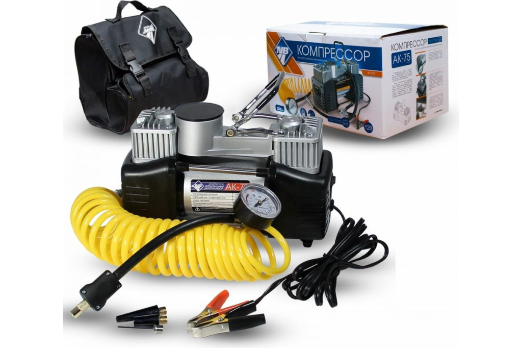 В комплекте предусмотрена сумка с двумя отделами для хранения компрессора и шланга, а также дополнительные насадки для накачивания лодок, матрасов, мячей и т.п., для