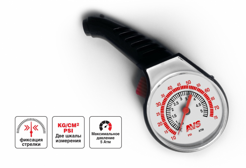 Аналоговый манометр, с помощью которого, без затруднений, любой автолюбитель сможет измерить давление в шинах. Необходимость такого аксессуара знает каждый автомобилист, хоть раз столкнувшийся с повреждением покрышки или ухудшением управляемости из-за приспущенных колес. • Две шкалы измерения давления (атм (bar) -> psi); • Диапазон измерений: 10,00-75,00 psi; 0,15-5,50 bar (бар = атм); • Погрешность прибора: ± 0,1 bar; • Фиксация стрелки.