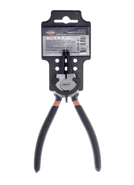 Съемник стопорных колец 170 мм AV Steel AV-628170 применяется для снятия и установки внешних стопорных колец с отверстиями с валов и шпилек при сборке-разборке различных механизмов, узлов и агрегатов. Изготовлен из углеродистой инструментальной стали. Изогнутая форма позволяет проводит работу в труднодоступных местах. Удобные, изолированные двухкомпонентными чехлами рукоятки повышают комфортность работы. Рекомендован для колец диаметрами от 19мм до 60мм.