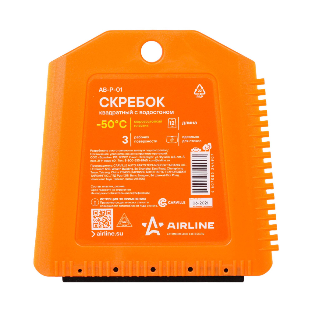 Скребок представляет собой изделие квадратной формы оранжевого цвета. На боковой и нижней части изделия расположены рабочие поверхности. Ребристая поверхность скребка позволяет удалить загрязнения или лед в сложно доступных местах, а водосгон устраняет разводы с корпуса автомобиля.